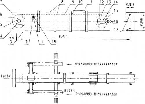 鏈式輸送機的驅(qū)動裝置采用XWD型行星擺線針輪減速機。輸送機的長度L以0.5米為一檔。FU150、200、270型輸送機的標準中間節(jié)長度為2米;非標準中間節(jié)長度為1.5米、1米。FU350型的標準中間節(jié)長度為3米;非標準中間節(jié)長度為2.5米、2米、1.5米。工藝布置時可選用數(shù)節(jié)標準中間節(jié)與數(shù)節(jié)非標準中間節(jié)組合成需要的機長L,并盡可能選用標準節(jié)組合。